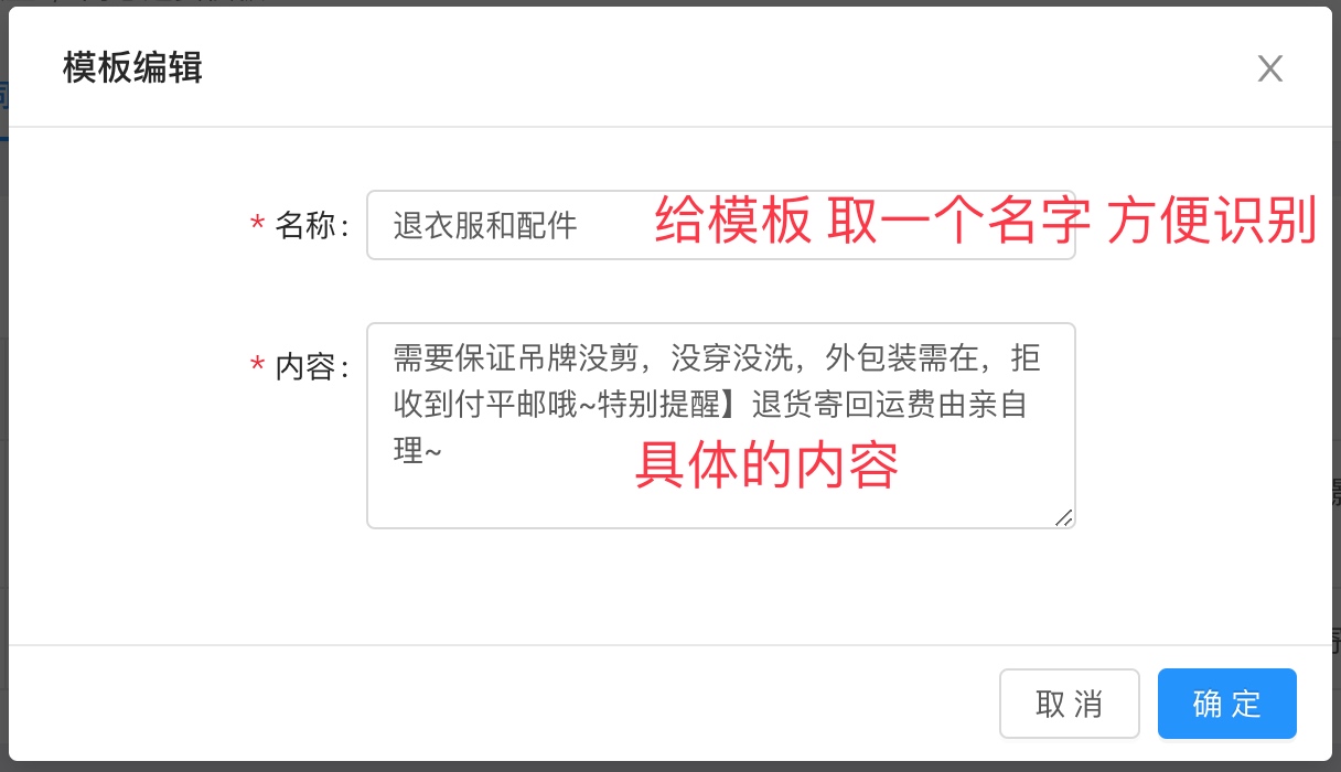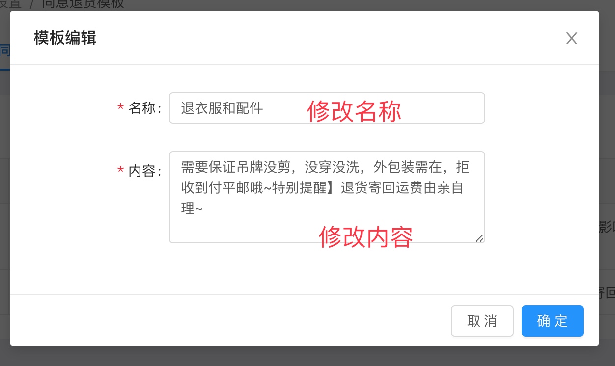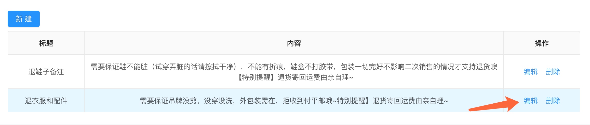 同意退货的模板,该功能的主要作用是在操作同意退货的时候,需要填写给买家的留言,例如「」。如果设定目标,可以避免打字填这些内容。